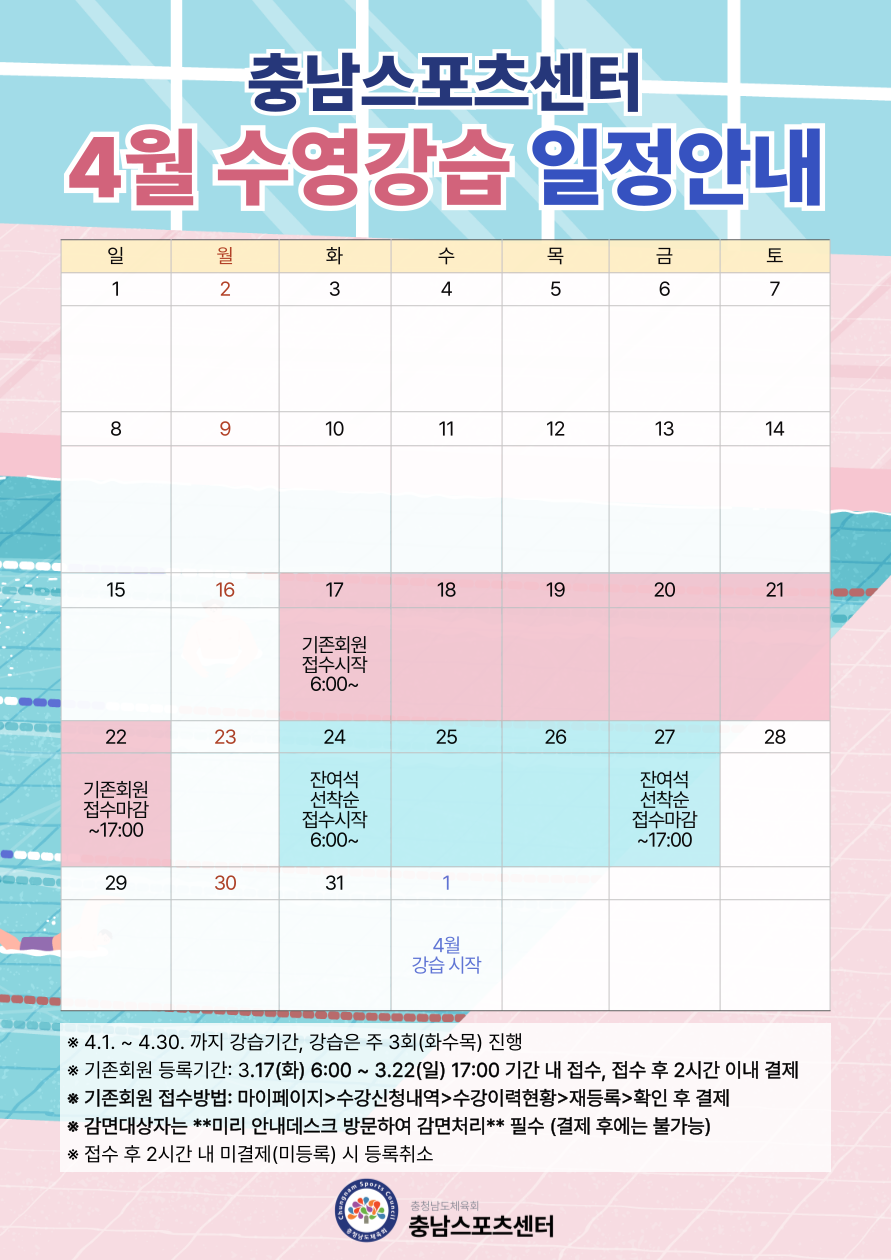 4월 수영강습 접수는 기존 3월 회원 우선으로 진행되며, 등록 일정은 다음과 같습니다.