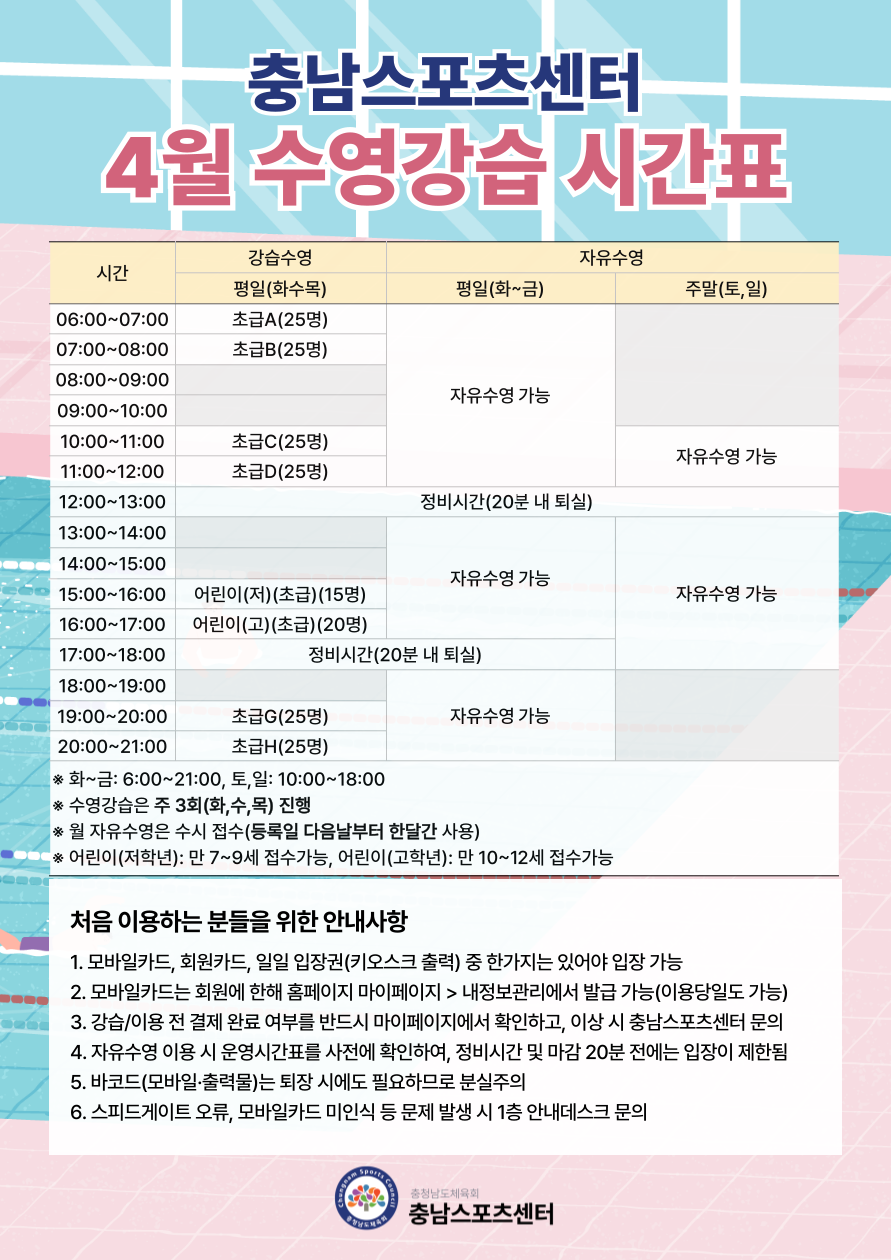 첨부된 「4월 수영강습 일정」, 「4월 수영강습 시간표」를 참고하시어